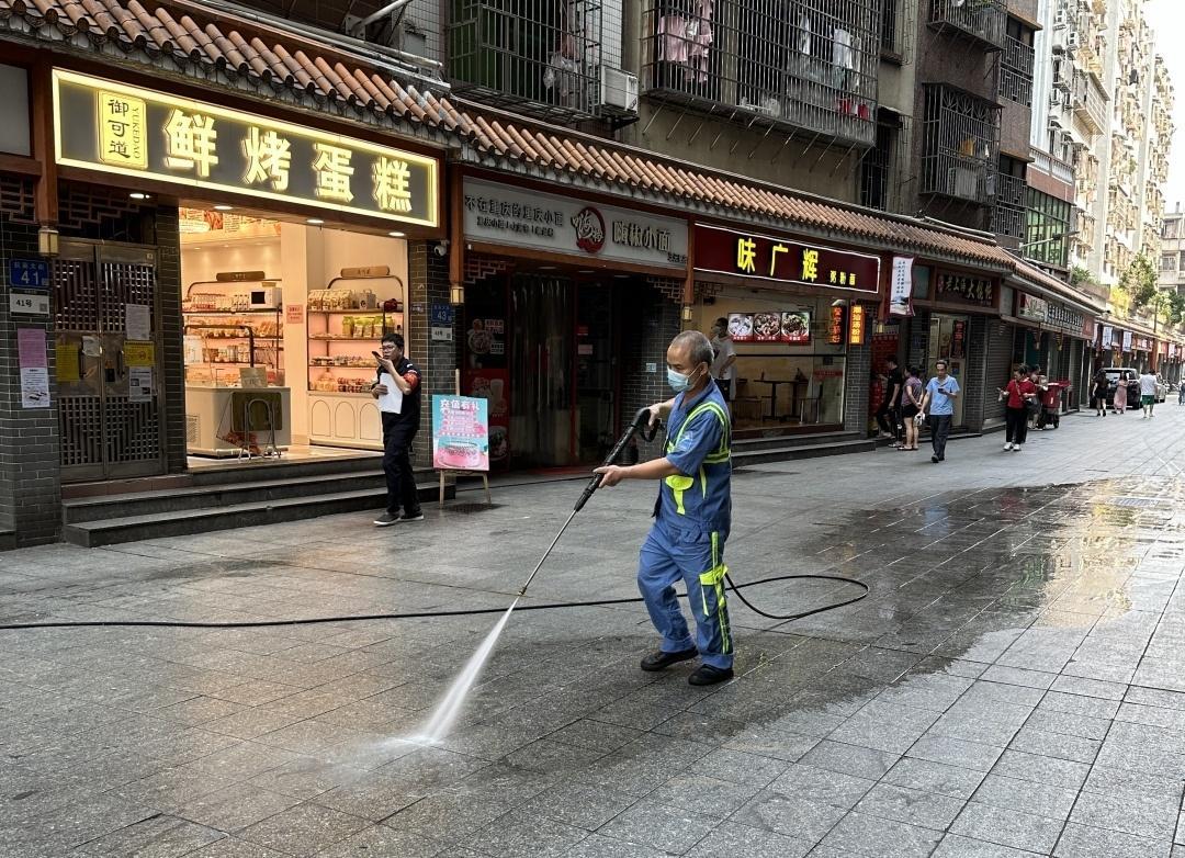 “今天方便多了,洗得很爽!以前到处都是车,冲洗麻烦还得很小心,很多小巷子保洁车进不去,没办法冲洗。”上午9时30分左右,韦师傅正在抗英大街一角用高压水枪冲洗地面,他告诉记者,以往到处摆放着电动自行车,冲洗地面困难重重,今天街面整洁多了,清洗的面积也增加了不少,“以往一车水(1立方米)就够了,今天可能要去到两车水才够。”
